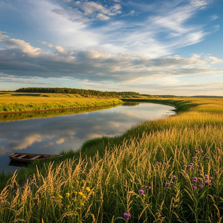 The warm, golden light of a sunset or sunrise bathes a vast expanse of tall, swaying grass in a meadow. Scattered wildflowers in red, blue, and yellow add pops of color to the natural landscape. The soft glow illuminates the blades of grass, creating a bokeh effect in the background. Rolling hills are visible in the distance, fading into the atmospheric haze. captures a moment of serene natural beauty and the tranquil ambiance of the countryside at dawn or dusk.