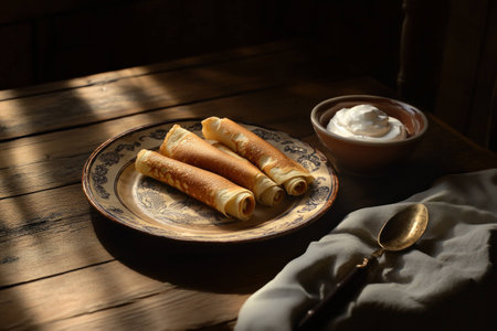 Delicious homemade pancakes with sour cream on a vintage plate, evoking a cozy, warm atmosphere perfect for a brunch setting
