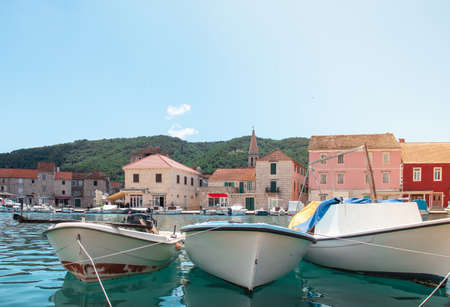 Waterfront view of old simple boats docked in the harbour of Starigrad, Hvar. City square in the background, old stone houses and church belltower rising above