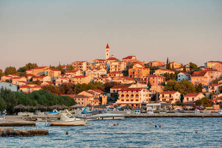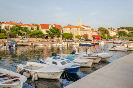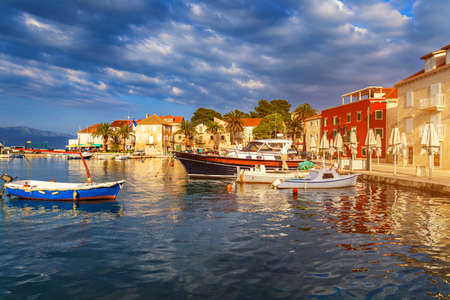 Supetar on Brac Island near Split, Croatia. Small seaside town with promenade and harbor with white boats, palm trees, cafes, houses and church. Tourists walk the street on sunny day at sunset