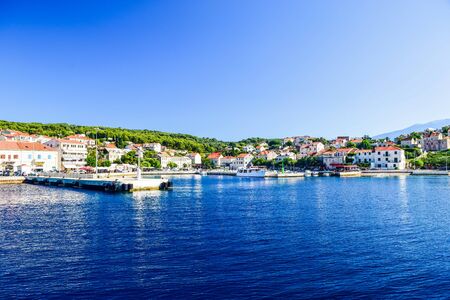 Supetar city in Brac island, Croatia. View from the sea. Picturesque scenic view on Supetar on Brac island, Croatia. Panoramic view on harbor of town Supetar from the side of sea. Brac, Croatia.