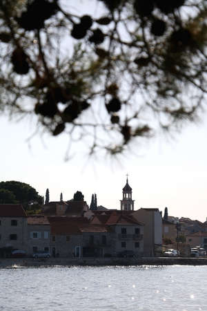 Beautiful view on Tisno, village with famous church, on island Murter, Dalmatia, Croatia, space for text, high resolution photo