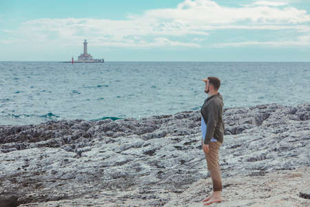young adult man walking by rocky sea beach barefoot summer vacation