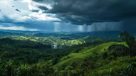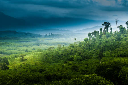 Rain storm over the green hills in the rainforest of Sri Lanka