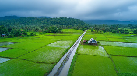 Aerial view of rice field in rainy season
