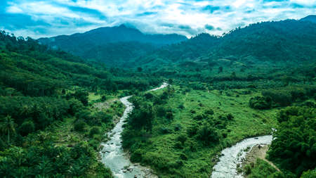 Beautiful natural scenery of rain forest and river in southeast Asia tropical green forest with mountain in background , Aerial view drone shot, Concept outdoor travel on vacation or holidays. tropical forest of thailand.
