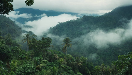A view of a tropical mountain landscape. The foreground is filled with lush, dense green vegetation, including prominent palm trees. Beyond, rolling mountains are covered in thick jungle, with layers of mist and fog swirling through the valleys and around the peaks. The sky is overcast, creating a soft, diffused light that enhances the moody and atmospheric of the scene. conveys a sense of remote, wild, and natural scenery.