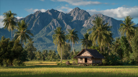 A picturesque rural scene featuring a charming thatched cottage nestled among vibrant rice fields, framed by towering mountains and swaying palm trees under a clear blue sky.