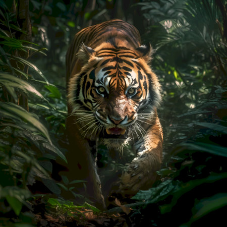 Majestic Tiger Sprinting at Full Speed in Lush Jungle Environment. Concept of Wildlife Power, Animal Agility, Nature Motion, Jungle Habitat, fast running.