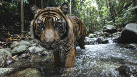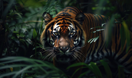An AI generated illustration of A majestic tiger stands alert amidst a lush jungle setting, its watchful gaze pointed toward the camera