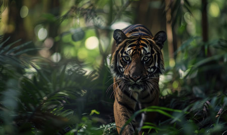 A striking tiger stalks gracefully through the dense undergrowth of a vibrant forest. Its intense gaze reveals both confidence and curiosity as mid-day sunlight enhances its vivid colors.