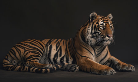 A Sumatran tiger lounging in a relaxed pose against a studio backdrop