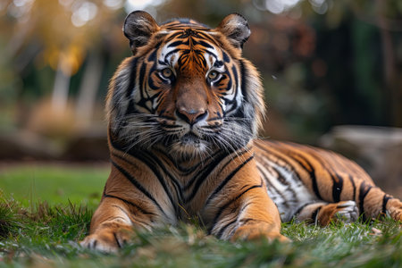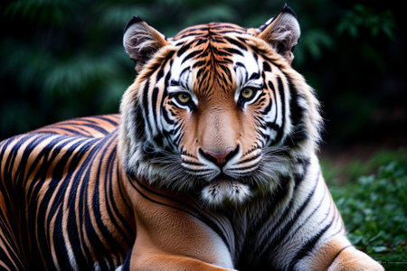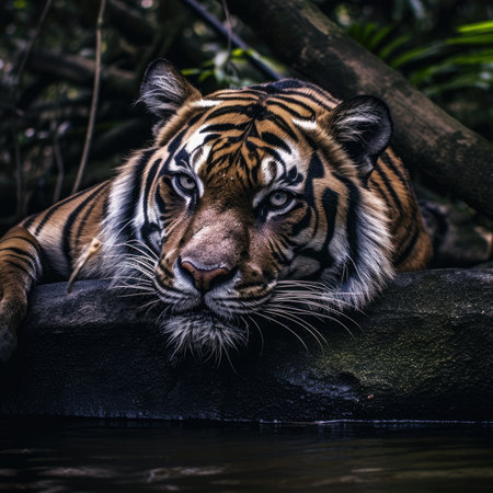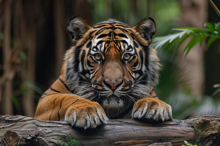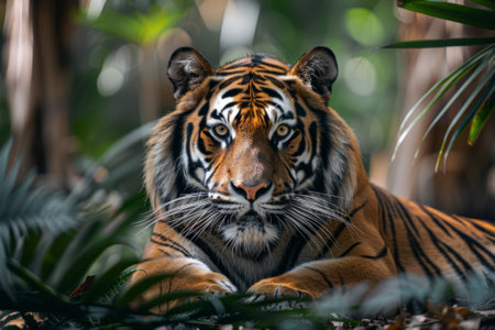 Tiger rests in tropical forest shade, showcasing exotic wildlife beauty.