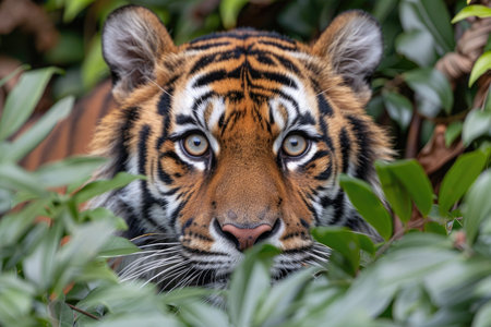 A powerful tiger peers intently through dense greenery in the wild showing its striking features.