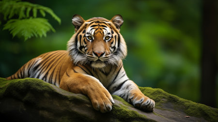 A regal Bengal tiger relaxes on a moss-covered rock in a lush jungle. This wildlife photograph captures the sharp detail of its powerful frame and striking gaze. AI-generated