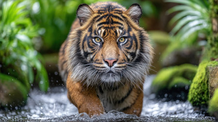 Striking, portrait of a large striped tiger moving forward through shallow, splashing water. The animal's intense yellow eyes are fixed forward, conveying alertness and power, while the background is filled with soft-focus, vibrant green tropical plants and moss-covered elements.