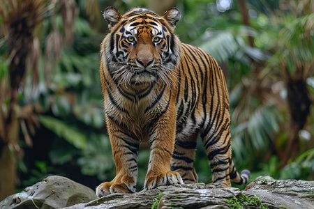 Sumatran Tiger standing on rock and looking at camera in zoo