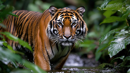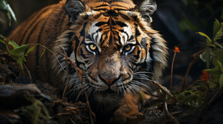 A majestic tiger in its natural jungle habitat, emphasizing wildlife, nature, and conservation.