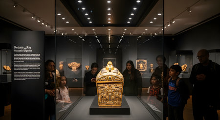 Discover a striking collection of historical artifacts displayed behind glass, highlighting intricate designs and the rich cultural heritage of ancient craftsmanship.