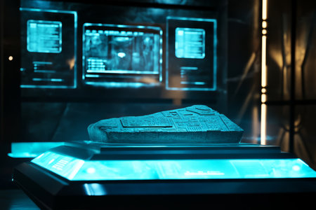 A futuristic museum 3D background featuring a glowing podium displaying an ancient artifact encased in protective glass. Interactive holographic panels float around, providing historical details in multiple languages.