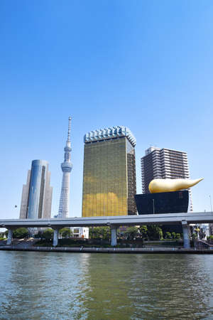 October 29, 2016: Tokyo skyscraper across the river in Asakusa including the Tokyo Skytree and the Asahi Beer Hall in Tokyo, Japan