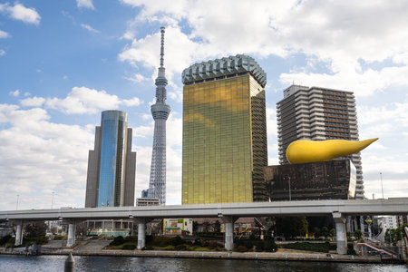 Tokyo, Japan. January 2024. panoramic view of the Asahi Group Head Office Building and the Tokyo Skytree tower in the city center