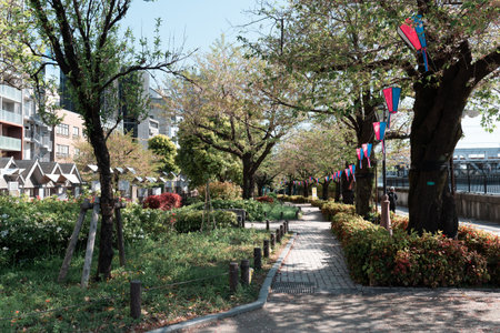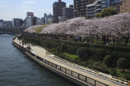 TOKYO, JAPAN - APRIL 9, 2023: People enjoy walking at Sumida reiver walk