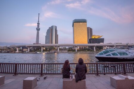 Tokyo, Japan - April 18, 2019 : View of Sumida River with Tokyo Skytree and The Asahi Beer building in Tokyo , Japan. Asakusa is a landmark of old town popular tourist spot.