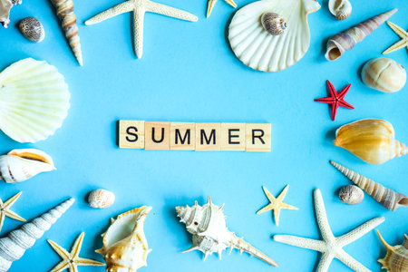 Inscription summer from paper of multi-colored letters and seashells and summer and sea accessories on a blue wooden table. Summer relaxation. vacation. top view