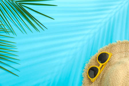 Palm leaves, straw hat and sunglasses on color background, space for text. Summer vacation backdrop