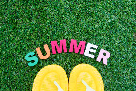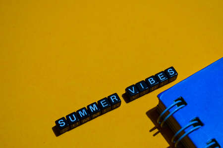 Wooden cubes with the word Summer on Yellow background, colorful bright summer concept . Cheerful close-up