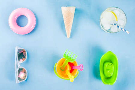 Summer vacation concept with plastic beach kids toys - bucket, scoop, rake, molds boat, lifebuoy toys copy space blue background