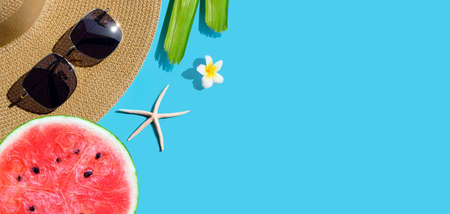 Summer hat with sunglasses and watermelon, starfish and plumeria flower on blue background. Summer background concept