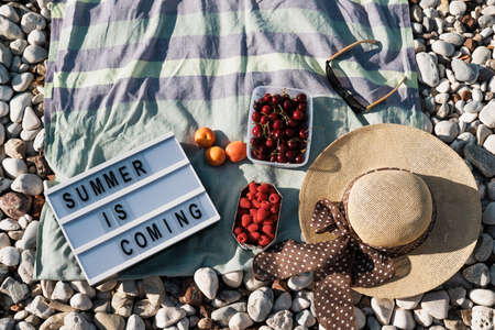 Summer composition with Letter Board Quote, hat, berries and sunglasses on a pebbles beach near sea
