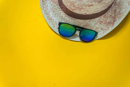 Hat weave and sunglasses in Yellow background.(travel beach)