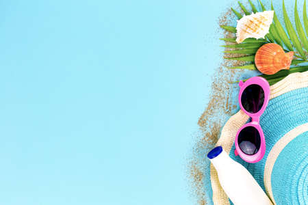 summer set top view,outfit and accessories of traveler on blue background with copy space, Travel concept.Overhead view of Traveler's accessories, Essential vacation items, Travel concept on blue background. top view