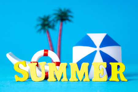 Word SUMMER made of yellow wooden letters with blurred toy palm trees, sunbed, lifebuoy and a parasol on the background. Vivid summer vacation composition.