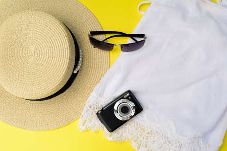 Travel concept with top, straw hat, sunglass, camera.