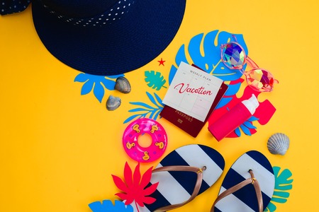 Traveling essentials from above. Vacation concept with tropical leaves, beach sandals, kaleidoscope sunglasses, tiny swim ring, broad-brimmed hat, sunscreen, seashells on a vibrant yellow background.