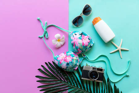 Summer items and accessories traveler woman colorful bikini , camera go to travel plan holiday vacation in the beach. Tropical sea. Unusual top view, Travel and Summertime Concept.
