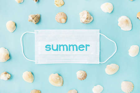 Medical face mask and seashells on blue background. Flat lying, copy space, holiday cancellation, pandemic, tourism.