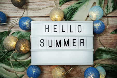 Hello Summer word in light box with LED cotton balls decoration on wooden background