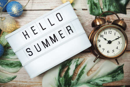 Hello Summer word in lightbox with alarm clock and Monstera Leave decoration on wooden background