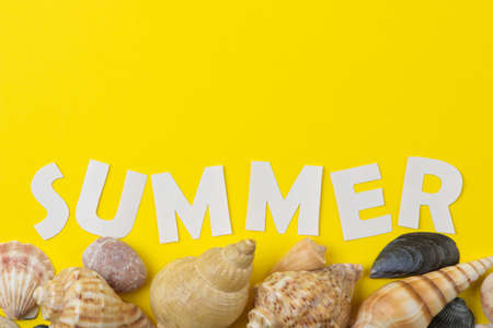 The inscription summer of paper white letters and seashells on a bright yellow background. Summer relaxation. vacation. top view