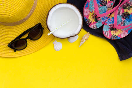 Top view of Beach accessories on yellow background with copy space
