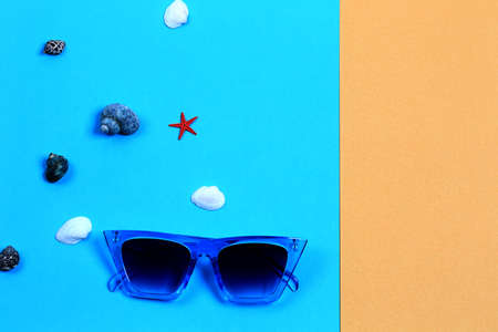 summer sunglasses on bright yellow-blue background with seashells