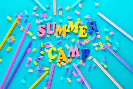 Words SUMMER CAMP and decor on color background