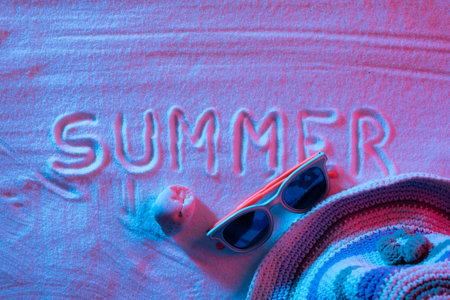 Summer ; written in the sand with hat and sunglasses ,Studio shot