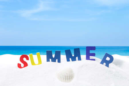 Summer season background, colorful summer font on white sand over blurred beach background, outdoor day light
