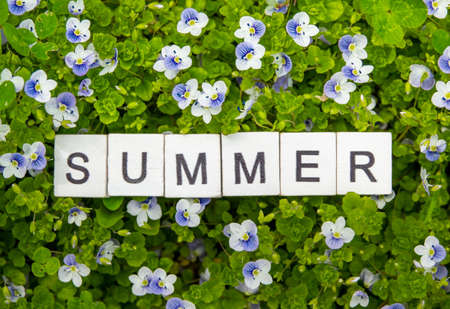 Word summer laid out on blue background close up. Concept summer. Minimalism.